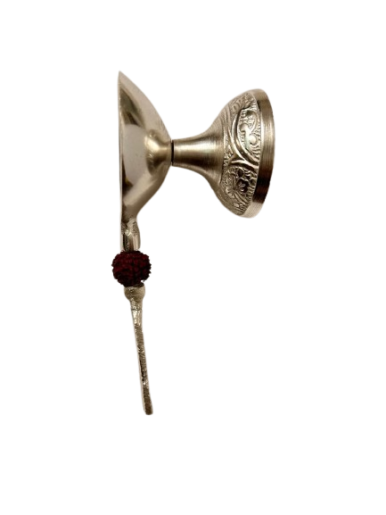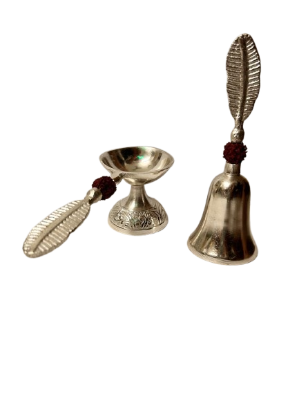 - Silver Plated Bell (14cm): Produces a clear, resonant sound ideal for aarti and meditation. The handle features ornate leaf-like detailing for a regal touch.