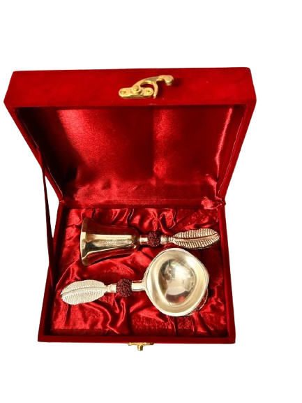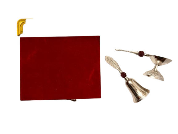 A beautifully crafted silver-plated bell and diya set, perfect for daily puja rituals, festive offerings, or spiritual gifting. Elegantly presented in a red velvet box with golden clasp.
