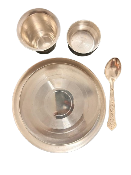 999 Silver Plated Pooja/Child Set (Plate, Glass, Katori, Spoon)