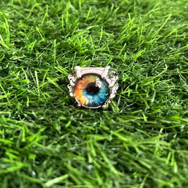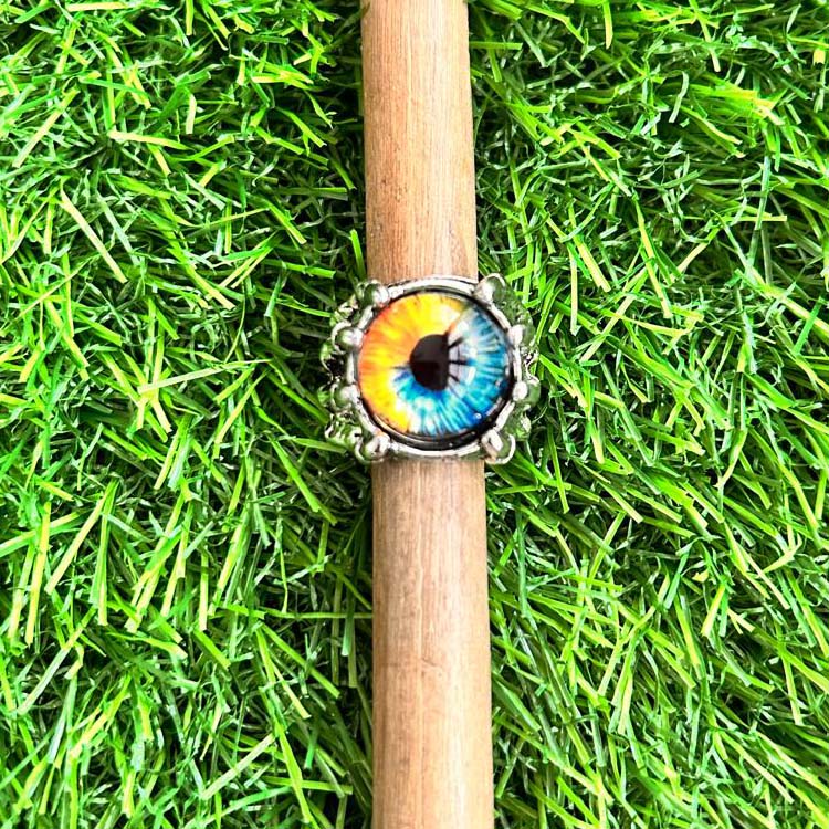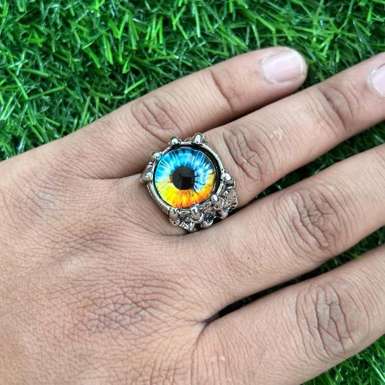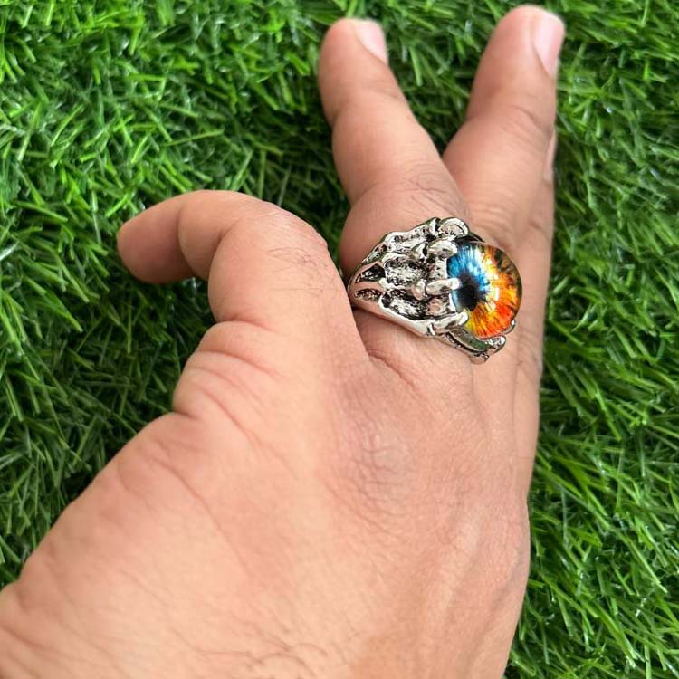 Gaze into the mystical with this captivating silver-plated ring featuring a vibrant, fiery dragon eye at its center, flanked by intricate skull and claw details. A powerful accessory for fantasy and gothic enthusiasts.
