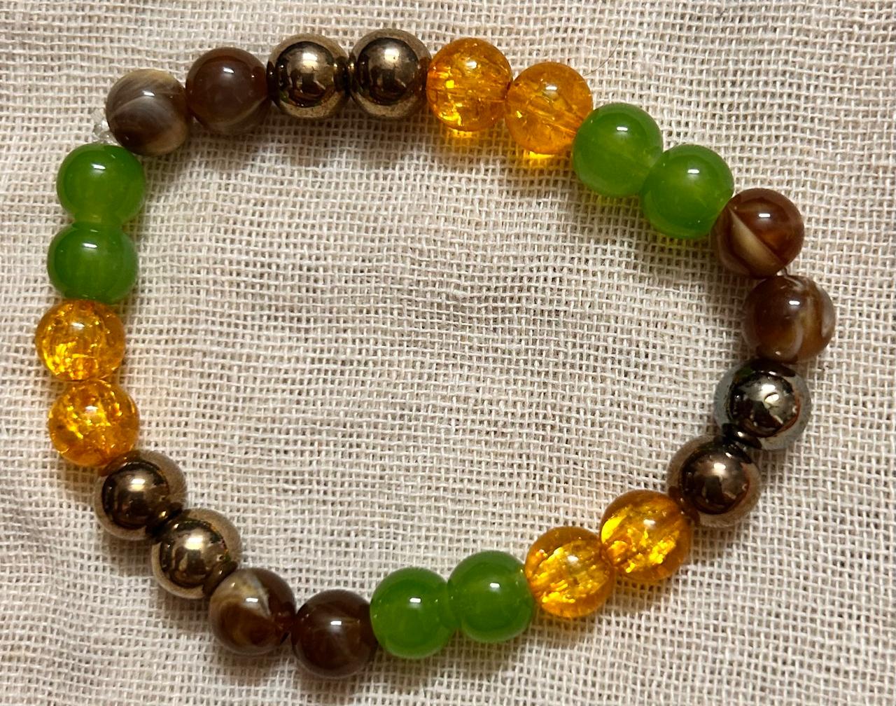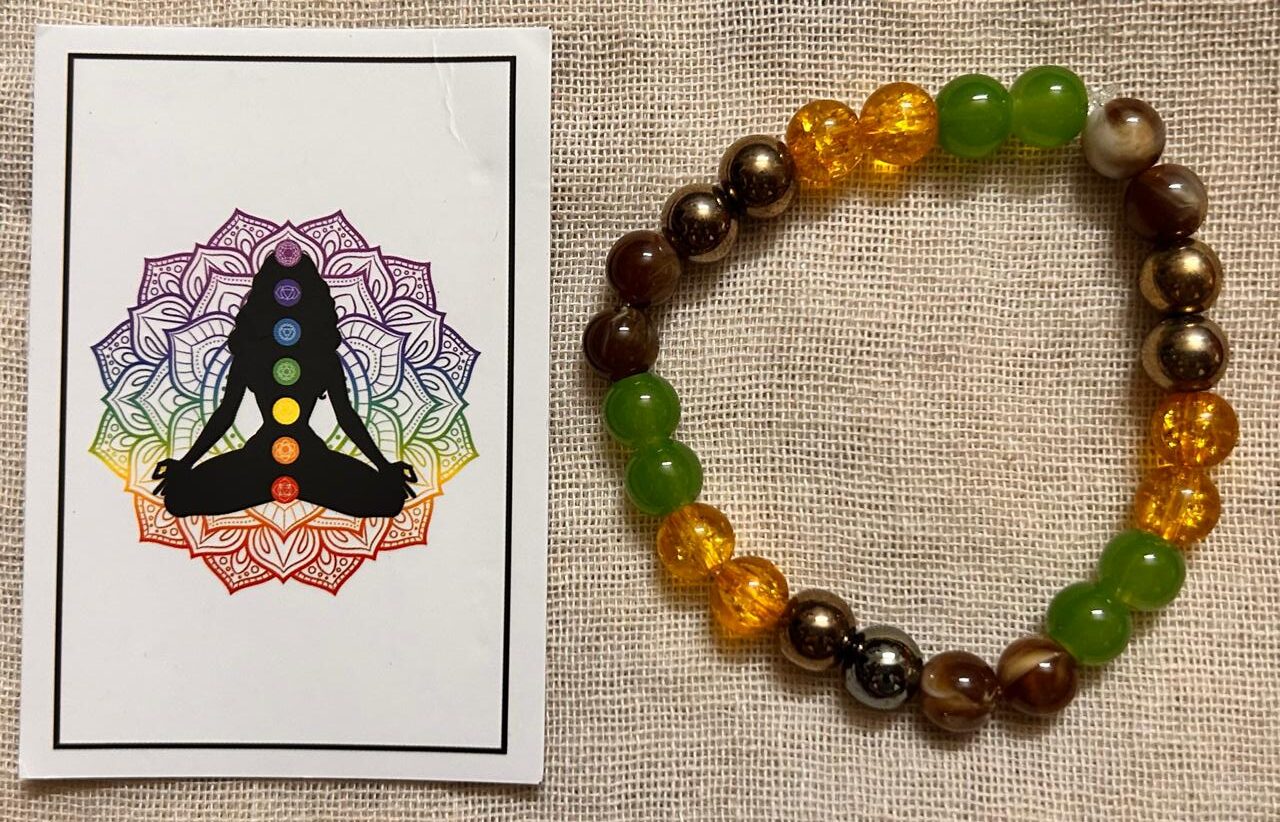 A vibrant crystal bracelet combining Tiger Eye, Green Aventurine, Citrine, and Pyrite—each known for attracting wealth, confidence, and opportunity. Stylish, spiritual, and adjustable.