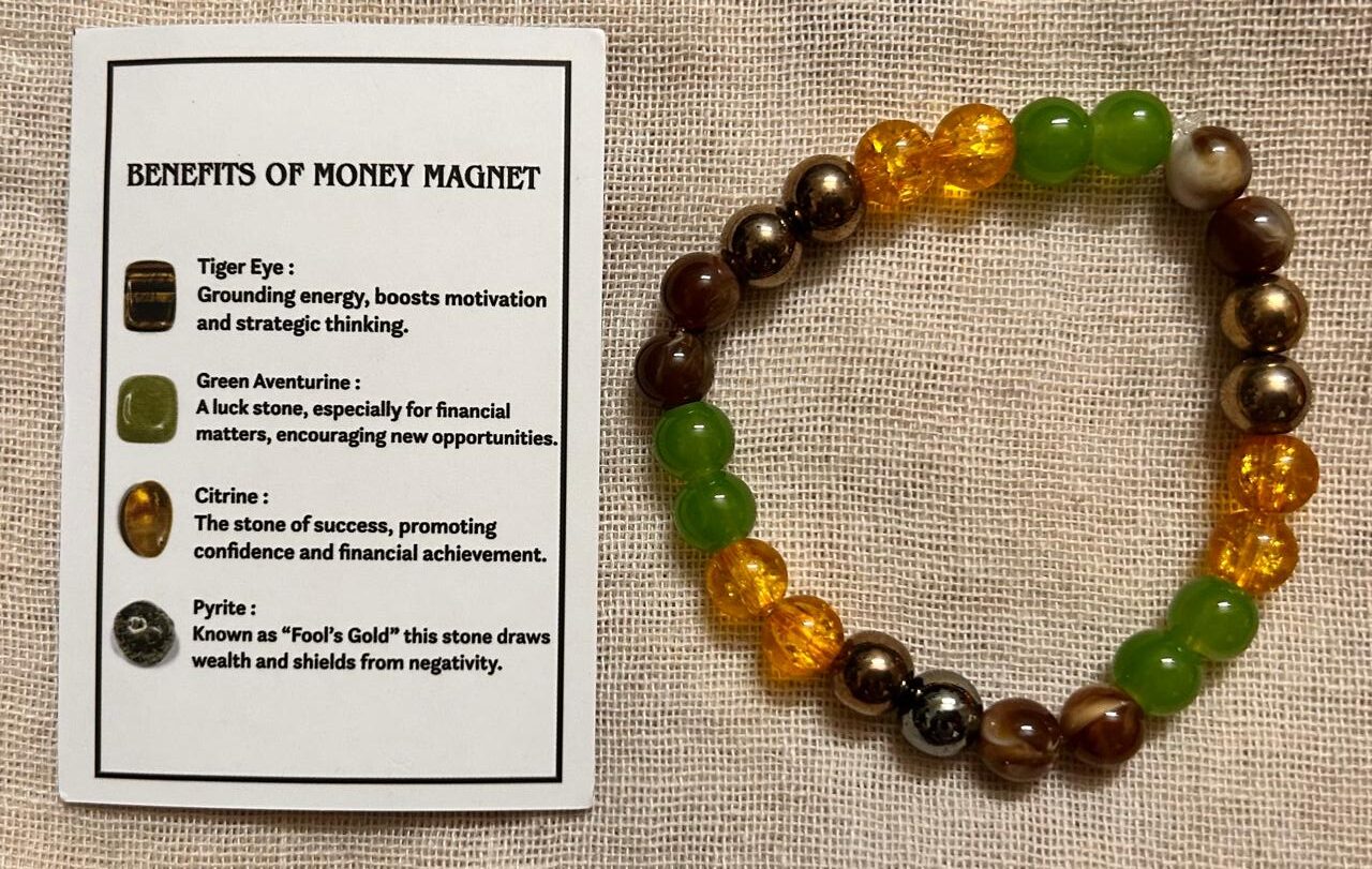 Harness the power of prosperity with this beautifully crafted Money Magnet Bracelet, designed to align your energy with abundance and success. This bracelet features a powerful combination of crystals, each selected for its unique financial and motivational benefits: